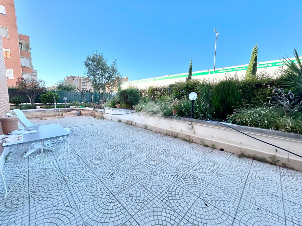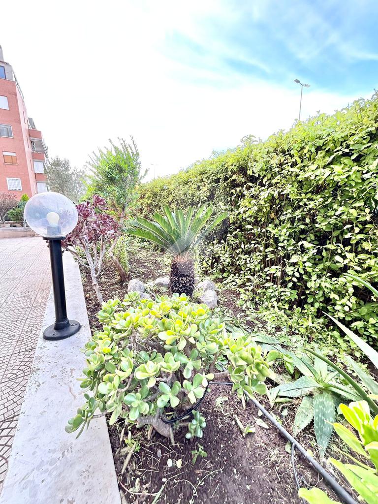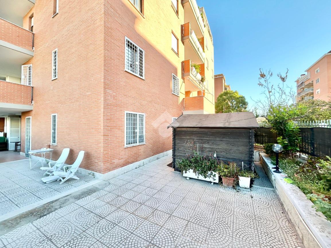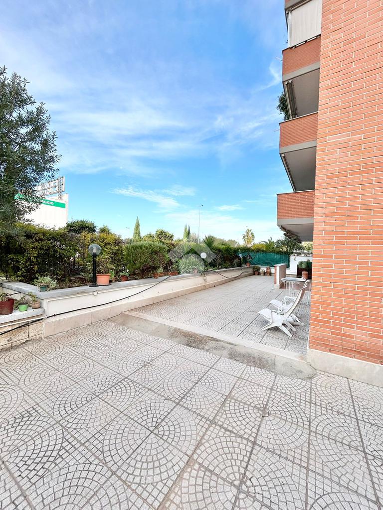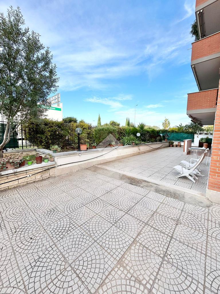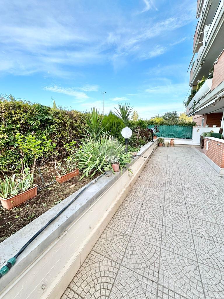 FONTE LAURENTINA, piena proprietà, in Via Signorini, costruzione 2005, disponiamo di un appartamento al piano terra con giardino quasi totalmente pavimentato di . 300 mq. L'immobile ha un doppio ingresso (uno dal portone ed uno dall'esterno), è disponibile immediatamente ed è composto da un soggiorno ampio, una cucina abitabile, 2 bagni e due camere da letto. Il riscaldamento e il condizionamento sono autonomi. La casa è provvista di tende da sole e di grate. Le pavimentazioni sono in cotto ed in parquet. COMPLETANO LA PROPRIETÀ UN BOX AUTO ED UNA CANTINA.